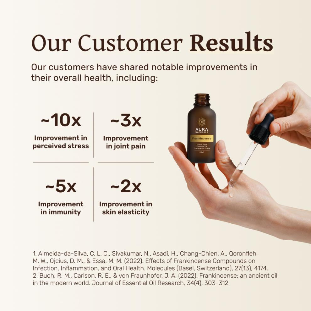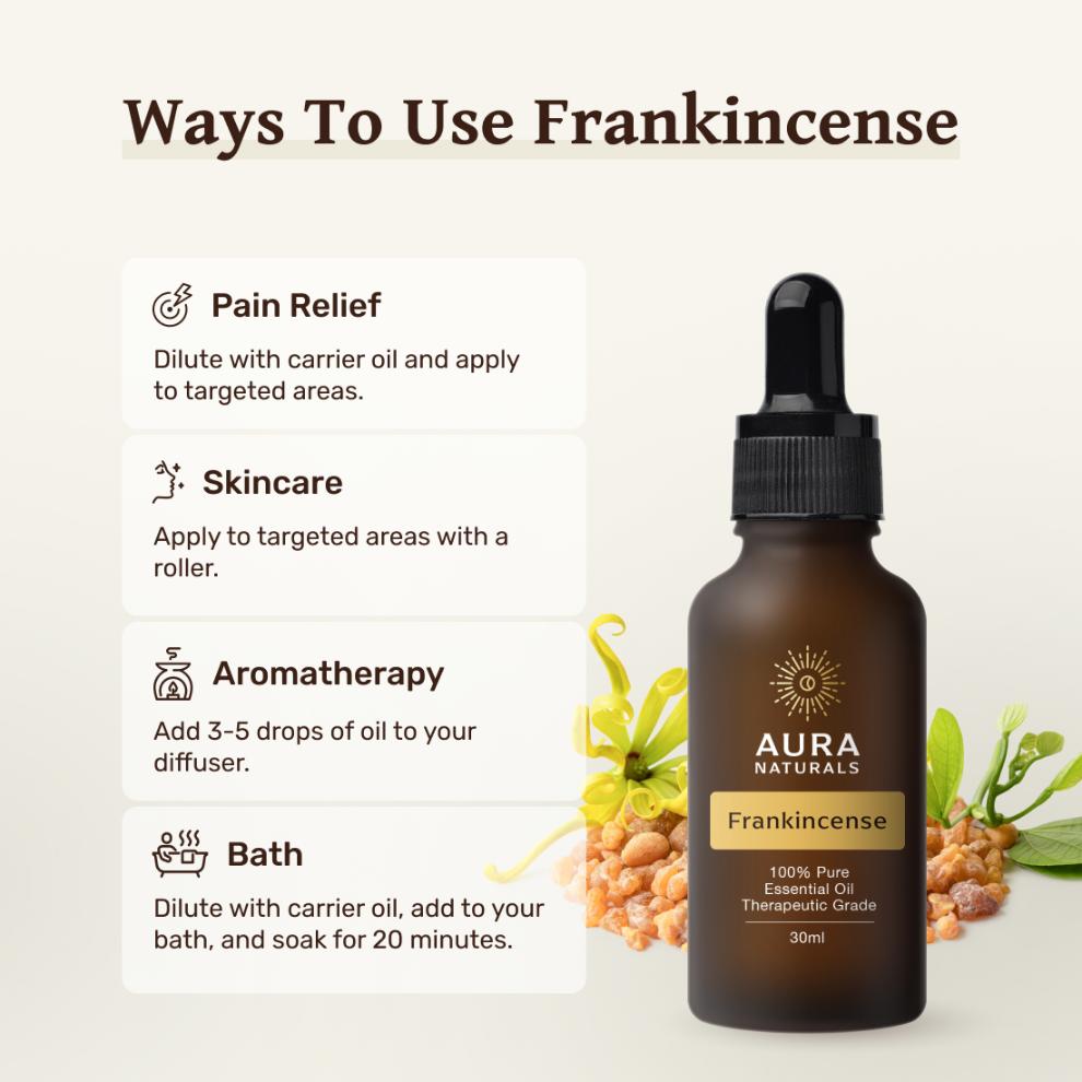 AuraNaturals Frankincense Oil is a therapeutic-grade essential oil, steam distilled from sustainably sourced Boswellia resin.