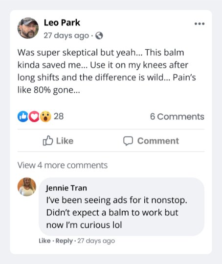 Rubbed it into my calves after leg day and was shocked how much less sore I felt the next morning. This balm is def not just for old people with joint pain!
