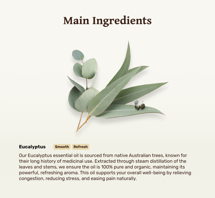 The essential oil is extracted through steam distillation using the leaves and stems of the Eucalyptus plant. Our oil is 100% pure and organic, preserving its fresh, strong aroma and natural effectiveness.