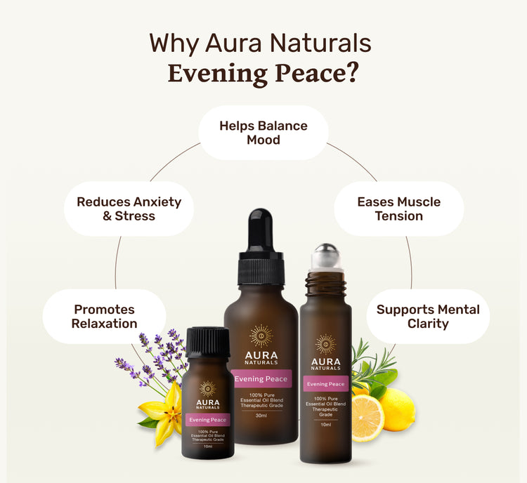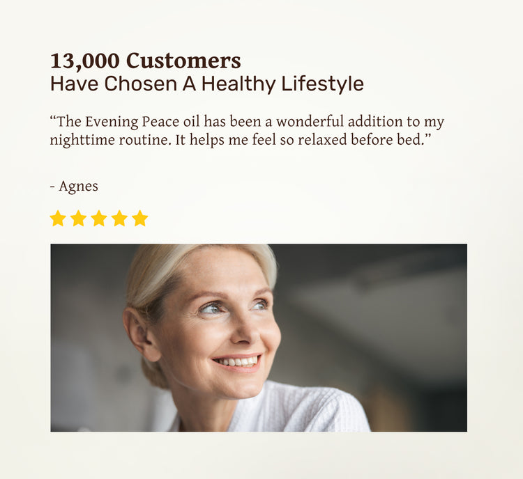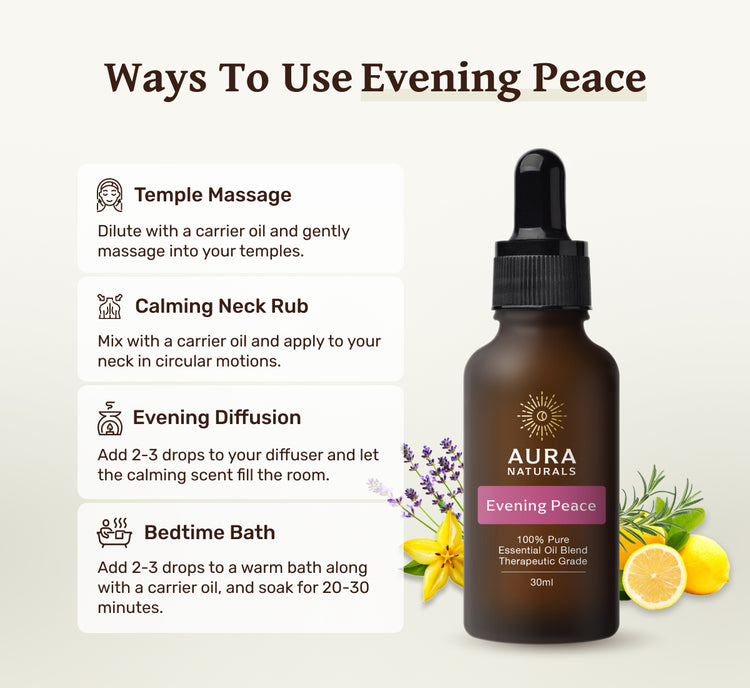 Dilute 1-2 drops of Evening Peace essential oil with a carrier oil. Gently massage your temples, neck, or chest to help relieve tension and promote a sense of calm. Use before bedtime for best results.
