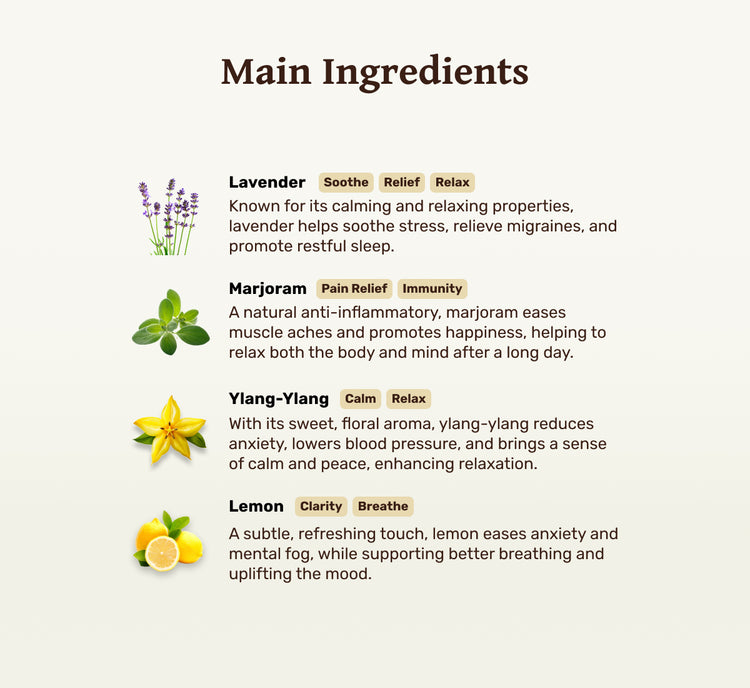 Ylang-ylang reduces anxiety, lowers blood pressure, and brings a sense of peace. Its delicate, floral aroma enhances your mood while promoting deeper relaxation. Lemon adds a bright yet subtle hint of freshness. It is known to ease anxiety and depression while also supporting better breathing and clearing mental fog.
