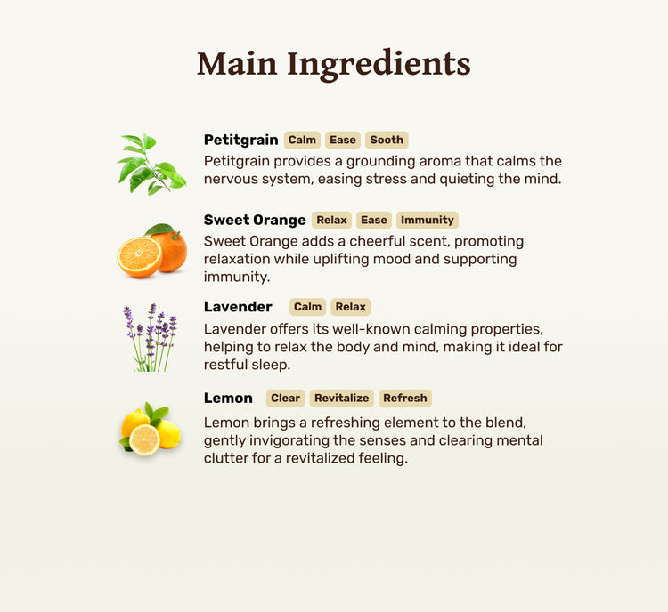 Petitgrain offers a grounding aroma that soothes the nervous system, helping to ease stress and quiet the mind. Sweet orange brightens the blend with its cheerful scent, promoting relaxation while boosting mood and immunity.