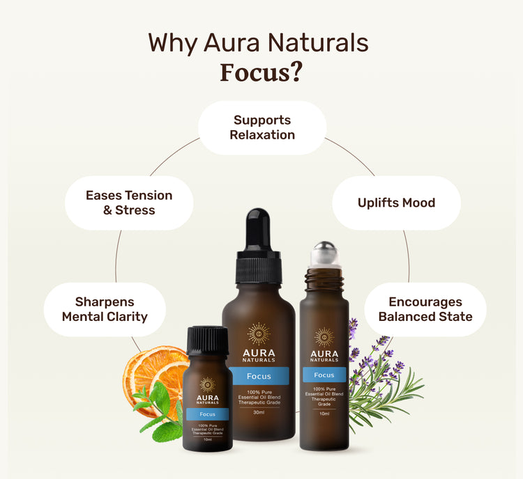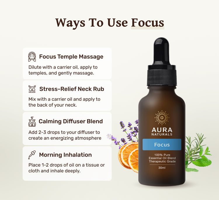 Apply 1-2 drops of Focus essential oil diluted with a carrier oil to your temples or neck. Massage gently in circular motions to help relieve tension and promote mental clarity. Use throughout the day as needed for focus and stress relief.