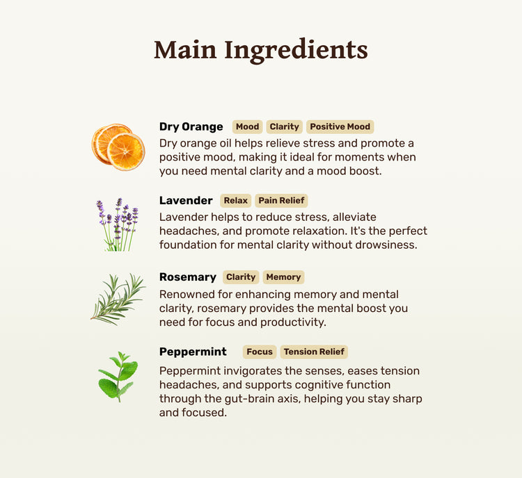 Focus is a blend of oils rich in history and therapeutic properties. Lavender, revered since ancient times for its purifying and calming qualities, brings a sense of tranquility. It has been used throughout the ages, from the ancient Egyptians to the Romans, to help calm the mind and relieve headaches, stress, and insomnia.