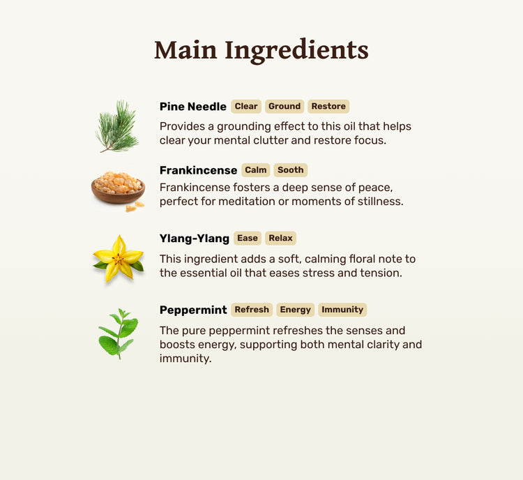 Pine needle provides a grounding effect, helping to clear mental clutter and restore focus. Frankincense fosters a deep sense of peace, making it perfect for meditation or moments of stillness. Ylang-ylang adds a soft, calming floral note, easing stress and tension.
