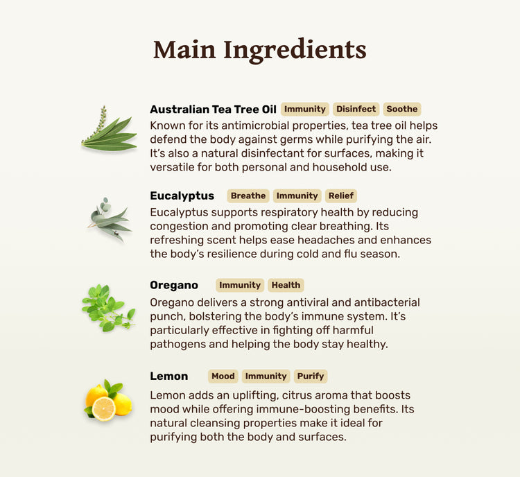 Australian tea tree oil, with its strong antimicrobial benefits, helps defend against germs while purifying the air. Eucalyptus enhances respiratory resilience, clearing congestion and supporting healthy breathing. Oregano brings a potent dose of antiviral and antibacterial power, strengthening the body’s natural defenses.