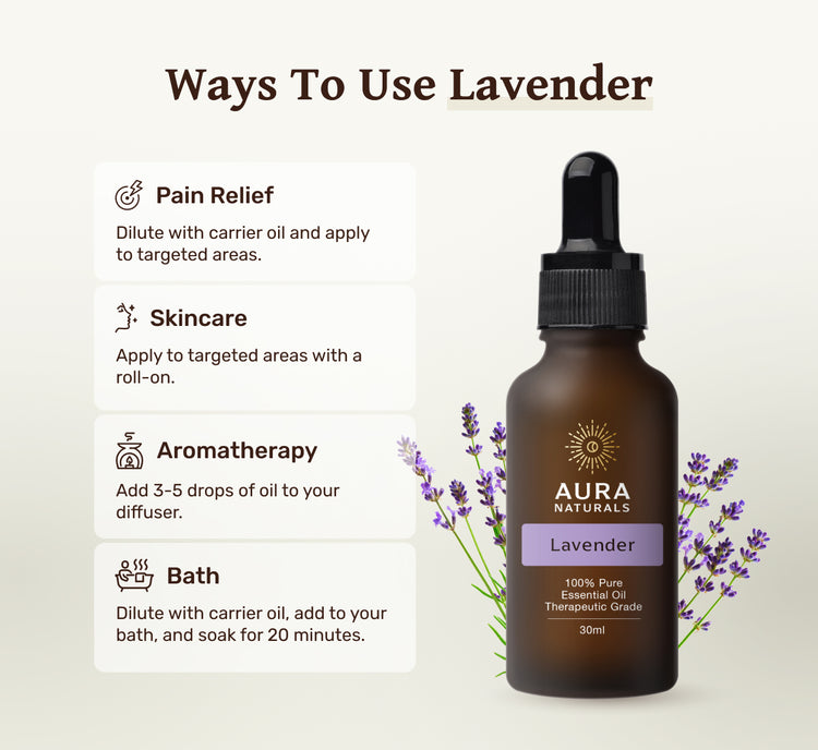 • Use a dropper to add 2-3 drops of Lavender oil with carrier oil into your bathtub to relax your whole body. Soak in warm water for 20-30 minutes.