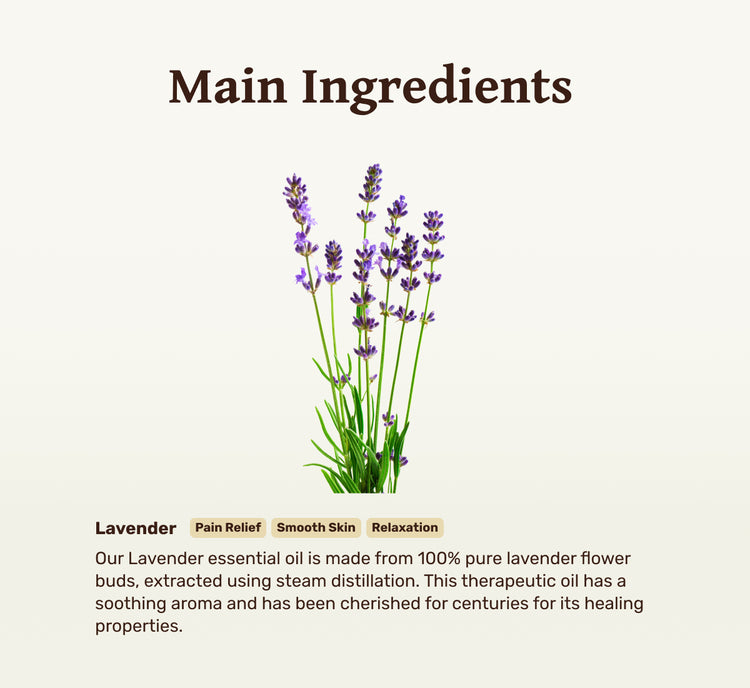 Our Lavender oil is 100% pure, bringing you the best therapeutic benefits. The soothing aroma oil is made from the flower buds of the Lavender plant using steam distillation.