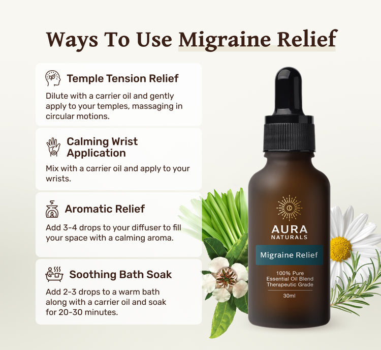 • Add 1-2 drops of Migraine Relief to your bath, mixed with 2-3 teaspoons of carrier oil. Soak for 20-30 minutes, allowing the blend to ease tension and provide gentle relief without overwhelming your senses.