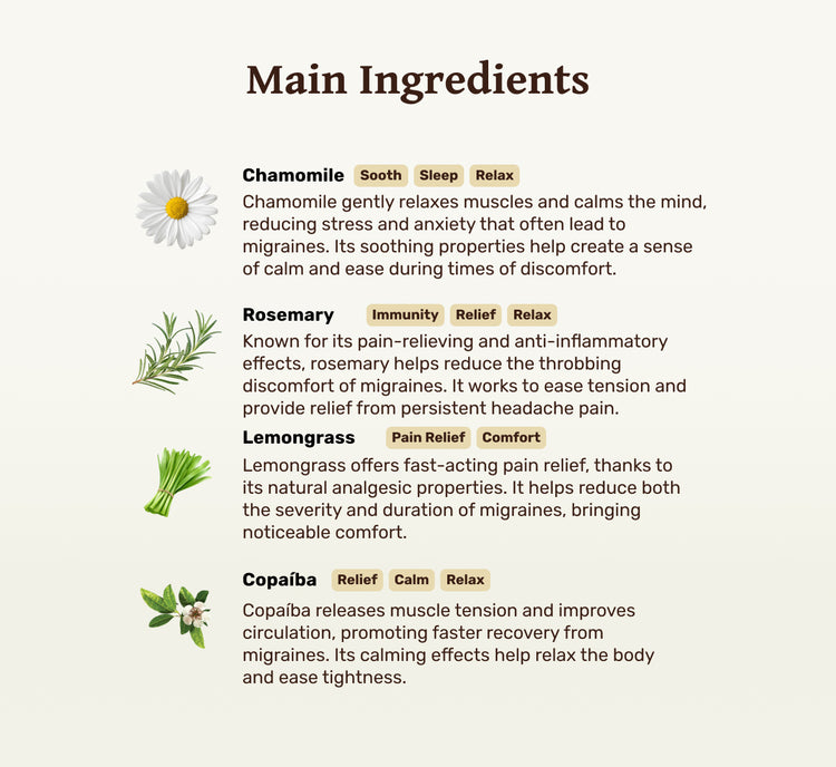 Chamomile gently relaxes muscles and calms the mind, offering relief from stress and anxiety that can trigger migraines. Rosemary, known for its pain-relieving properties, helps reduce inflammation and ease throbbing discomfort.